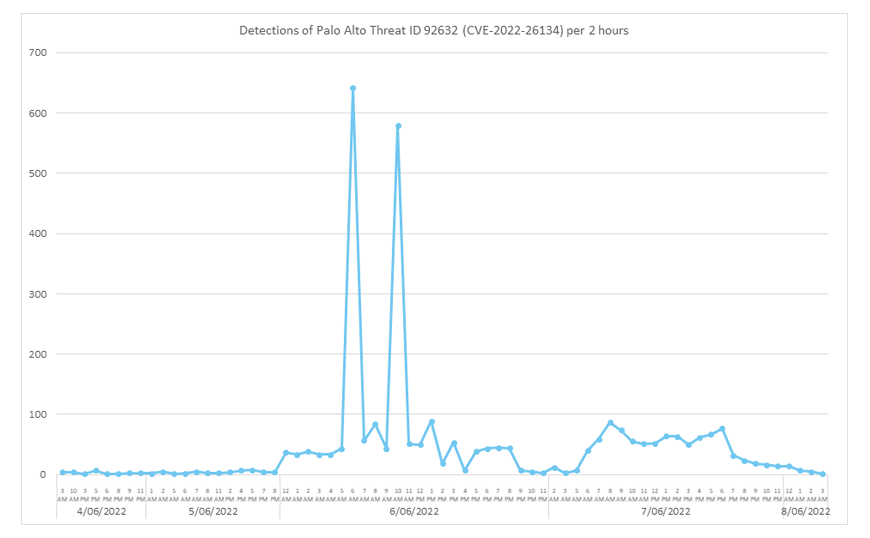 The following chart plots Palo Alto Firewall alerts for AARNet SOC relating to Threat ID 92632 (CVE-2022-26134).