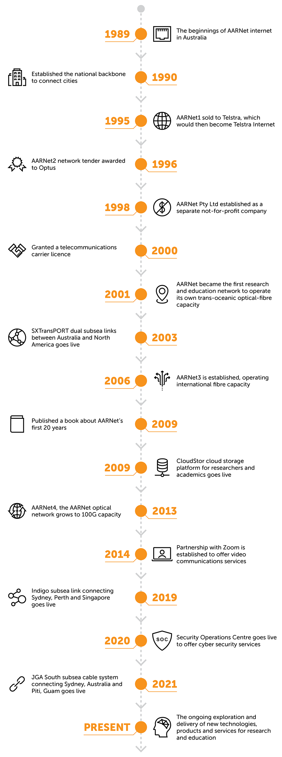 In 1989, a group of Australian universities and research institutes established Australia’s Academic And Research Network, also known as AARNet.