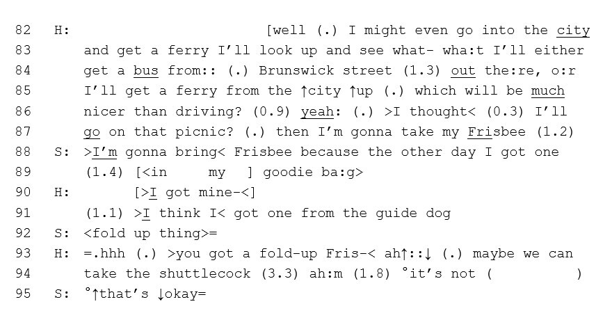 Jefferson transcription example, Prof. Michael Haugh, Griffith Corpus of Spoken Australian English 2009 (GCAusE01). Glossary; [] – overlapping speech; (.) – a brief interval; underline – emphasis; : (colon) – stretched sound; (1.3) – a pause of 1.3 seconds; ↑ – rise in intonation, ↓ – fall in intonation; >< – quickened speech rate, <> – slowed speech rate; = – no break; .hhh – in breath, .h – short in breath; °° – softer than surrounding talk; ( ) – speech was not transcribed.