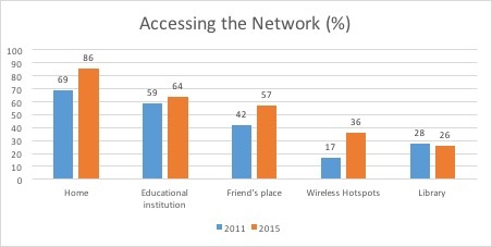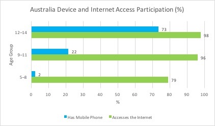 74% of 14-17 year olds use a computer to access the internet. 80% own or have a Smartphone, with 65% using a mobile phone access data services (Roy Morgan Single Source, June 2015). By comparison the numbers in the United States are 73% and 91% respectively ( Teens, Social Media & Technology Overview 2015, Pew Research Internet Project, 9 April 2015), and a plausible trajectory for Australia. Even the youngest of school age students are users of the network (Figure 1).