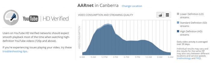 The Video Quality Report provided by Google (Figure 3) provides an indication on the experience a user may expect from their Service Provider. AARNet consistently sits at above 90% for HD quality video delivery (Note: the 10% of SD video delivered across the AARNet network is largely related to third party last mile circuit capabilities of school aggregations.) and demonstrates the peak demand curve around school attendance hours. It is worth noting these metrics are related to service delivery to sites with hundreds and often thousands of students sitting behind a single connection and demonstrates the effectiveness of a for-purpose R&E network architecture.